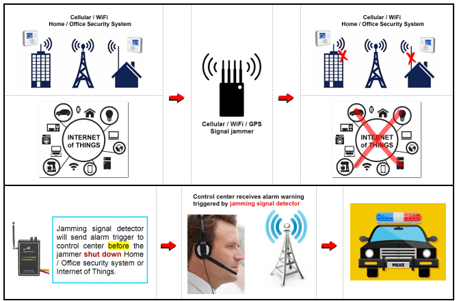 Современные системы безопасности используют различные коммуникационные технологии для передачи данных сигнала тревоги или видео через беспроводную технологию 315/433/868 МГц, мобильную связь или WiFi. Однако опытные преступники используют блокаторы сигналов для блокировки радиосигнальных коммуникаций этих систем безопасности. Данное устройство предназначено для предотвращения использования преступниками блокаторов сигналов для отключения соединений (315/433/868 МГц, WiFi и мобильной связи) систем безопасности жилых домов, офисов или заводов — таким образом предотвращая проникновение и кражу ценных имуществ или информации. Прежде чем коммуникация 315/433/868 МГц, WiFi или мобильной связи системы безопасности будет заблокирована, устройство выдает сигнал тревоги (триггер тревоги), который отправляется обратно в центр контроля для уведомления о попытке кражи или ограбления.