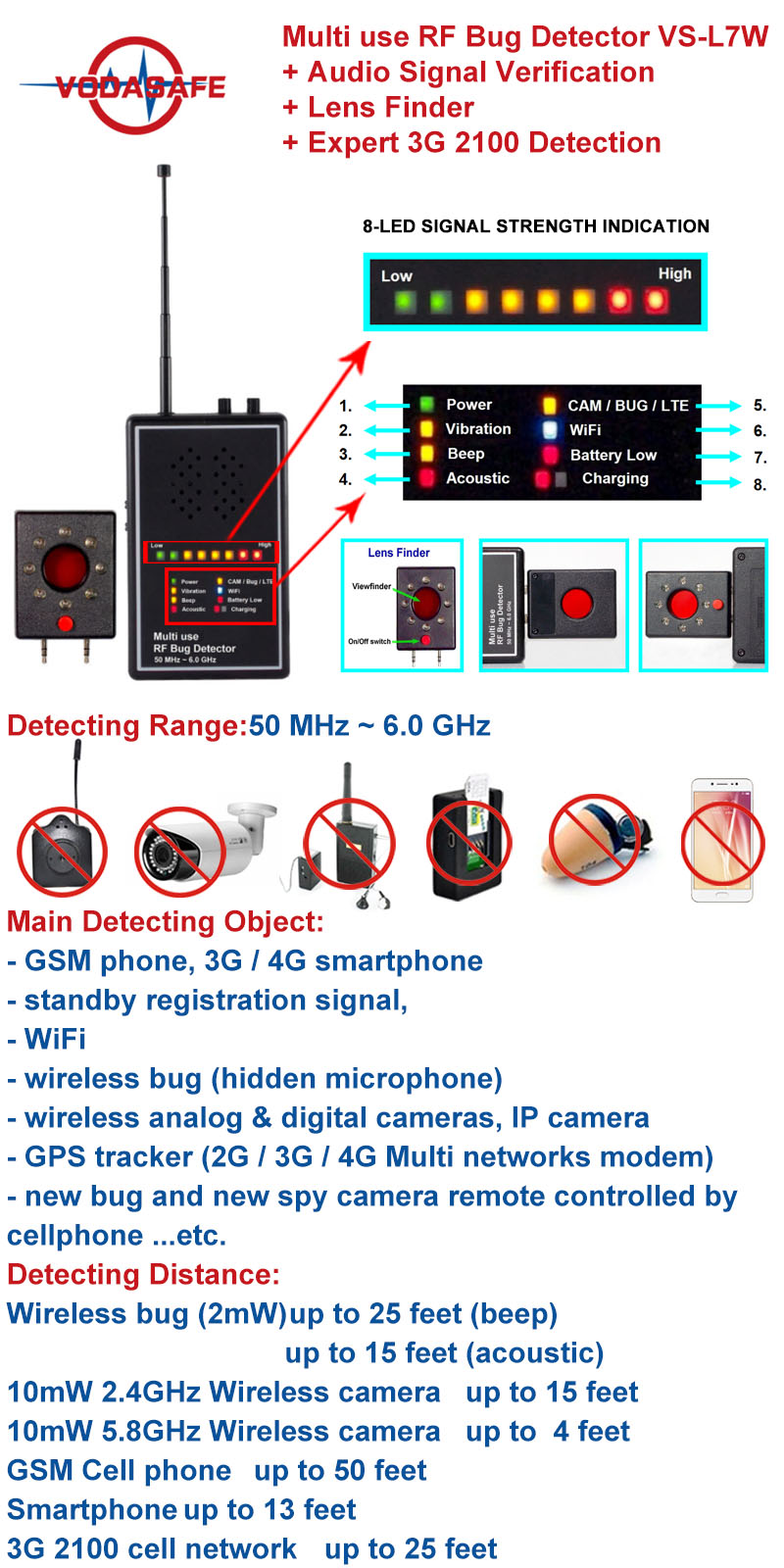 Sz Vodasafe VS-L7W — это высокотехнологичное устройство для обнаружения, предназначенное для идентификации скрытых беспроводных камер, шпионских микрофонов и различных сигнальных передач. Оснащенное передовыми технологиями, оно предлагает универсальные функции для обнаружения радиосигналов, скрытых линз и аудиопередач, что делает его незаменимым инструментом для защиты личной жизни и проведения охранных проверок.